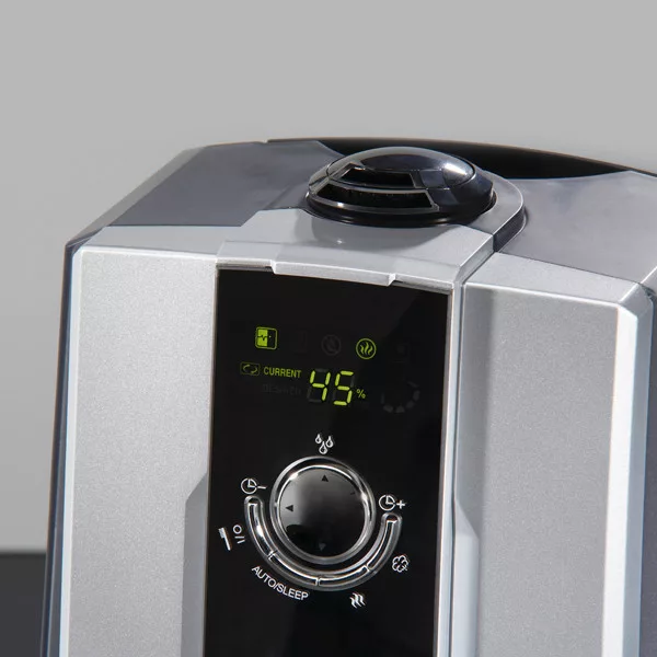 A nagy méretű többfunkciós LCD kijelző mutatja a használattal kapcsolatos összes paramétert: a mért és a kívánt páratartalmat, az automata és éjszakai üzemmódot, a víztartály állapotát, az előmelegítést.