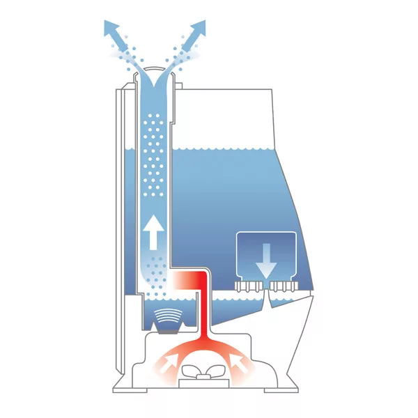 A BONECO 7142 ultrahangos párásító készülék, amely a vízporlasztás elvén működik. A víz mikroszkopikus cseppekre porlasztása után lényegében párát fúj ki.