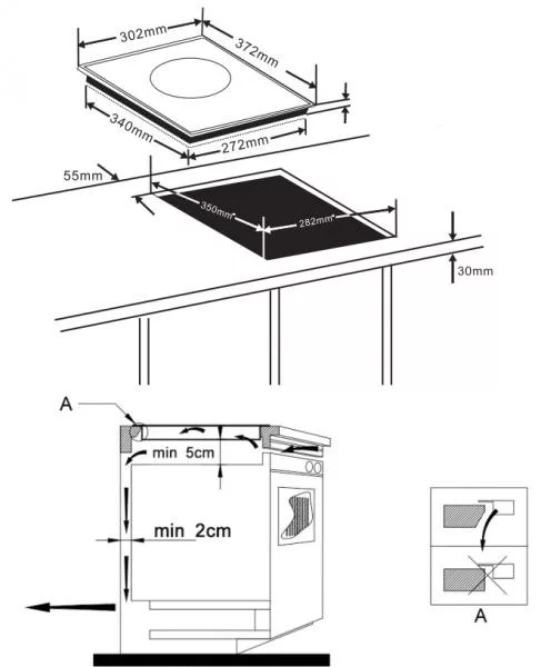 Beépített indukciós főzőlaphoz megfelelő szellőzést kell biztosítani